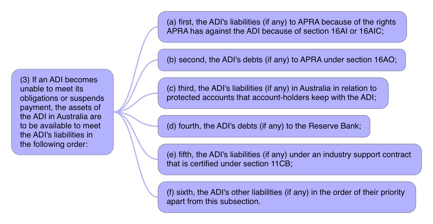 The only liabilities that rank ahead of bank deposits are certain liabilities to APRA including costs that APRA incurs in the exercise of the powers it employs pursuant to Section 13A of the act (see above). These liabilities are defined elsewhere in the Banking Act but, so far as I can determine, the most material of them is likely to be liabilities that APRA takes over from depositors of a failed ADI pursuant to the operation of the Government guarantee of deposits under the Financial Claims Scheme (FCS).