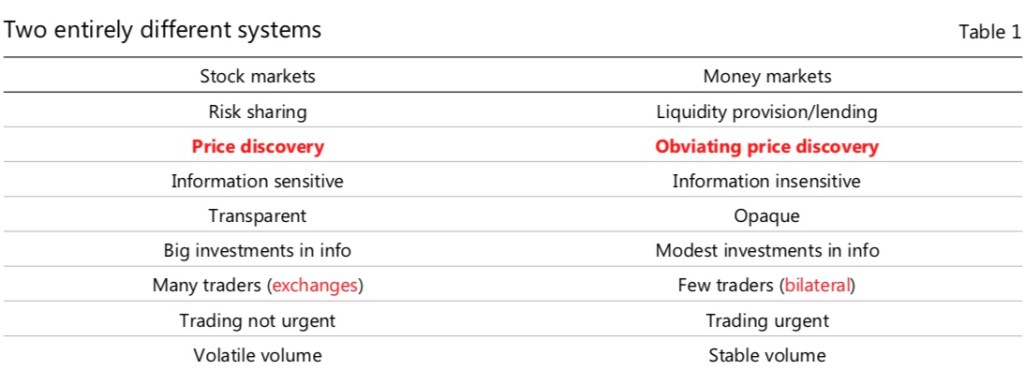 “The design of money market policies and regulations should recognise that money markets are very different from stock markets. Lessons from the latter rarely apply to the former, because markets for risk-sharing and markets for funding have their own separate logic. The result is two coherent systems with practices that are in almost every respect polar opposites.”